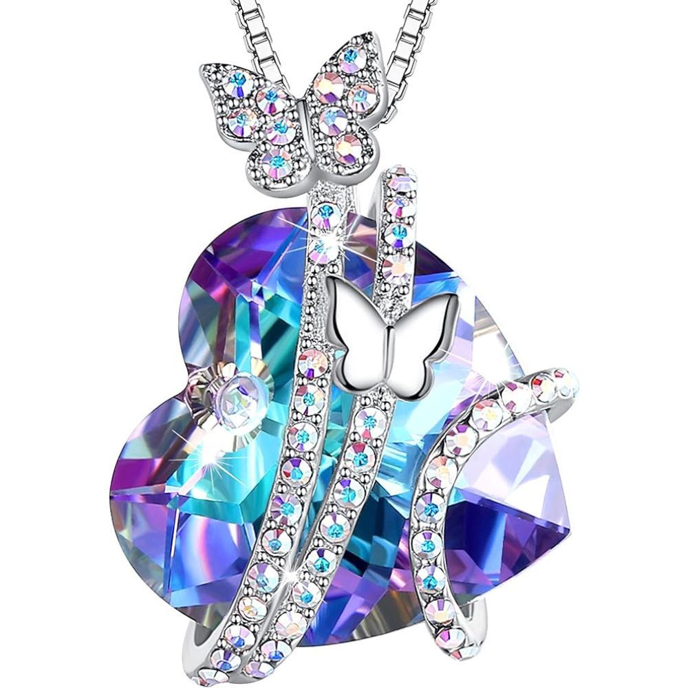 Butterfly symbolize love, hope and rebirth. The dainty, sparkling heart-shaped crystal design with white gold plated finish comes on an attached 18-inch chain with a 2-inch extender.